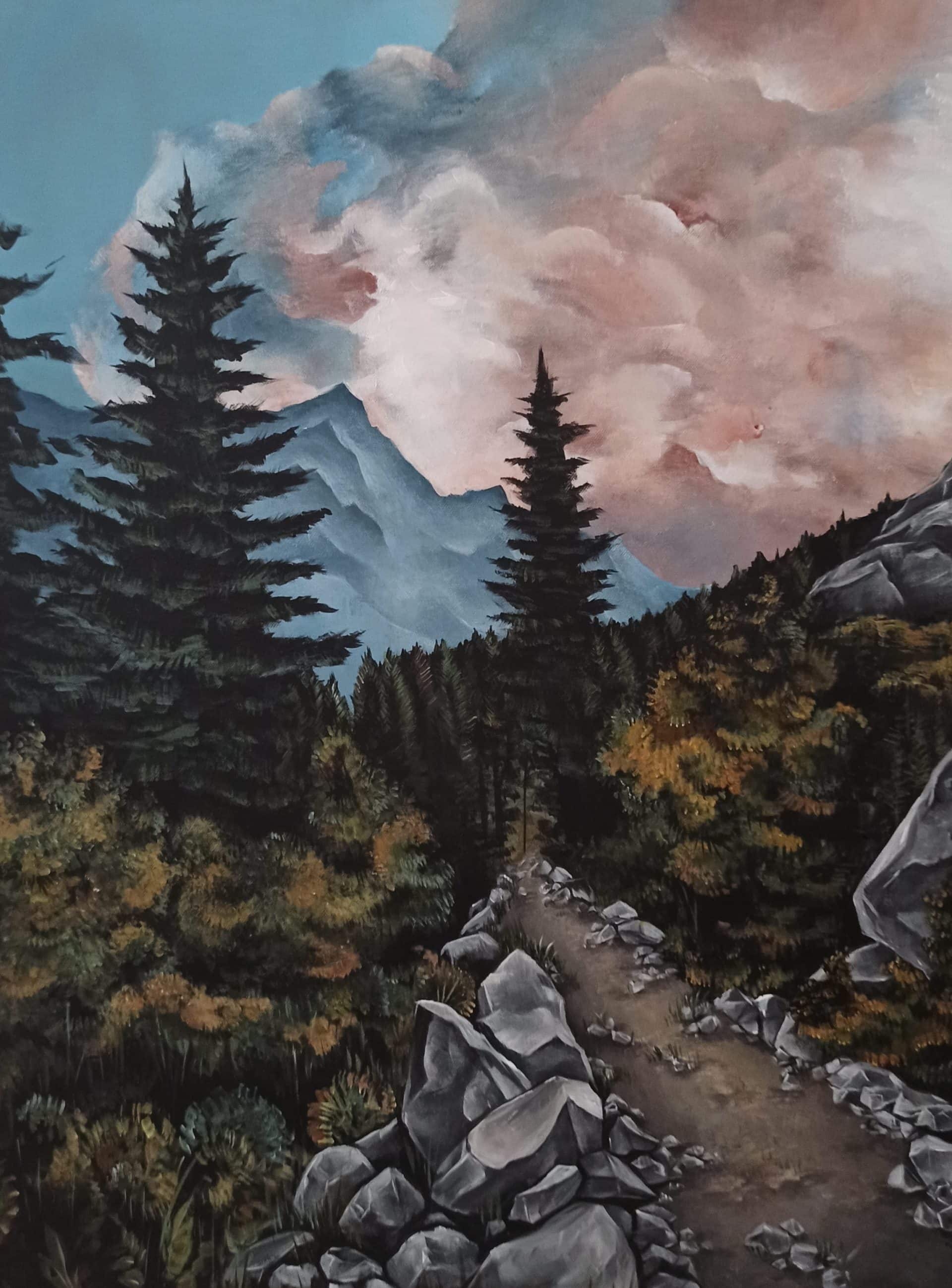 Bergregionen sind geprägt von extremen Witterungen und einzigartiger Natur. Das Augenmerk liegt bei diesem Bild vor allem auf dem Himmel, an dem sich rötliche Wolken auftun. Im Vordergrund ist ein Wanderweg zu sehen, umrandet von wilder Natur und Geröll. Die Steine wirken grob und scharfkantig und ergeben mit den vielen Sträuchern und Bäumen das Bild unberührter Natur.